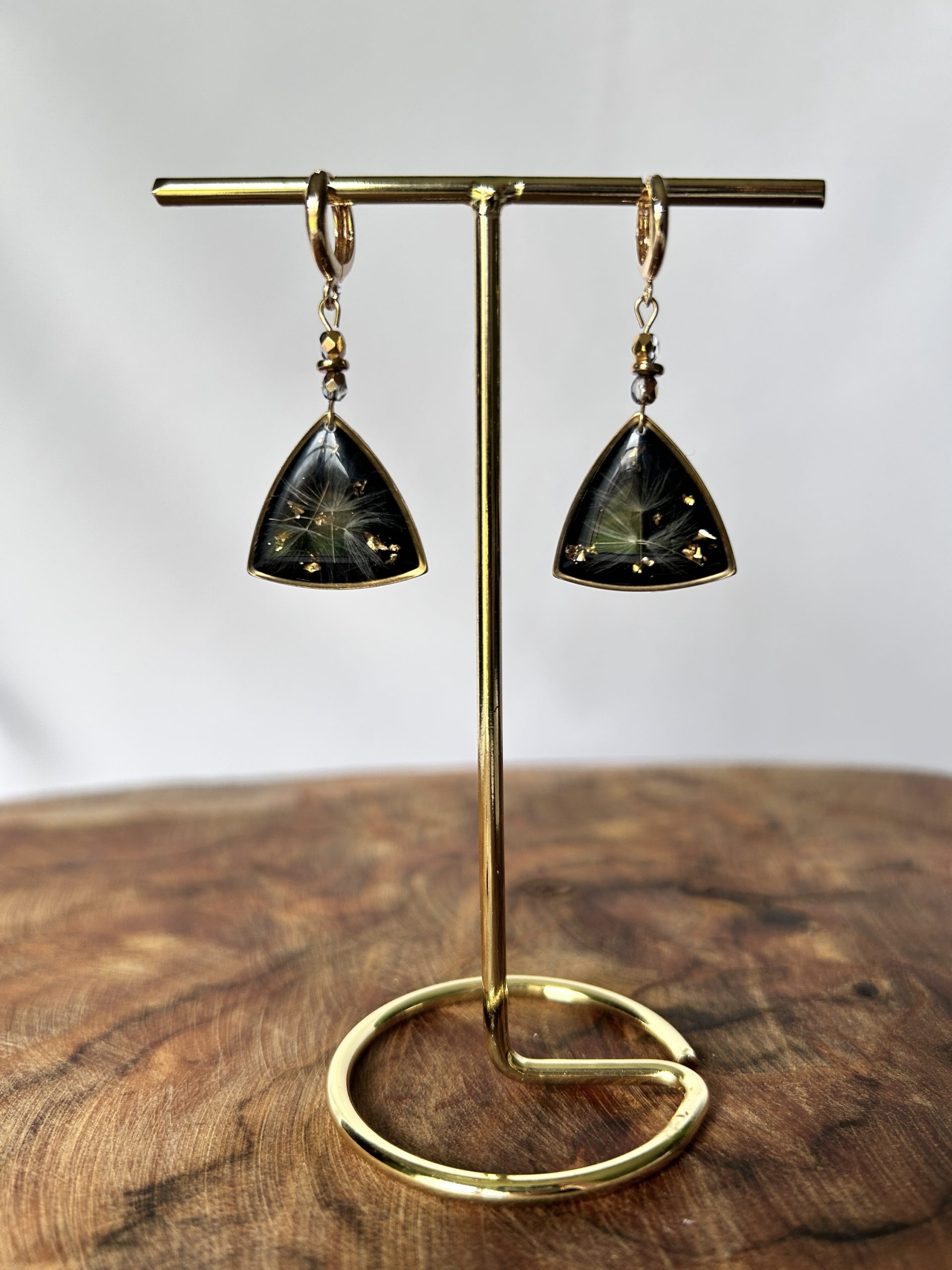 Zatrzymaj piękno natury na zawsze dzięki wyjątkowym kolczykom z żywicy epoksydowej. Delikatne dmuchawce zatopione na głębokim, czarnym tle, co podkreśla ich naturalny urok i wyjątkowy charakter. Kształt złotej ramki przypominający trójkąt nadaje biżuterii nowoczesnego wyrazu, a płatki złota dopełniają całość nadając im elegancji.