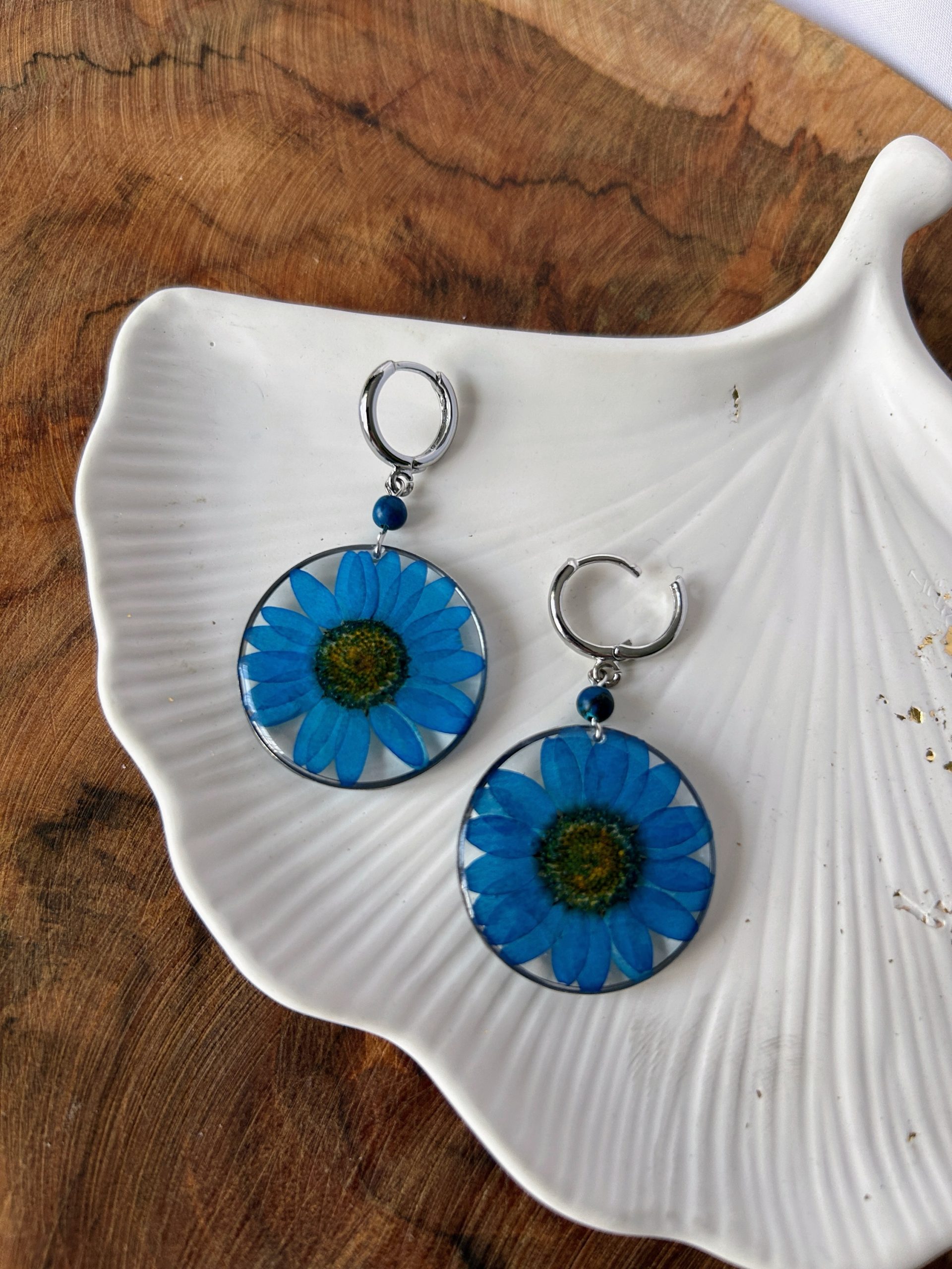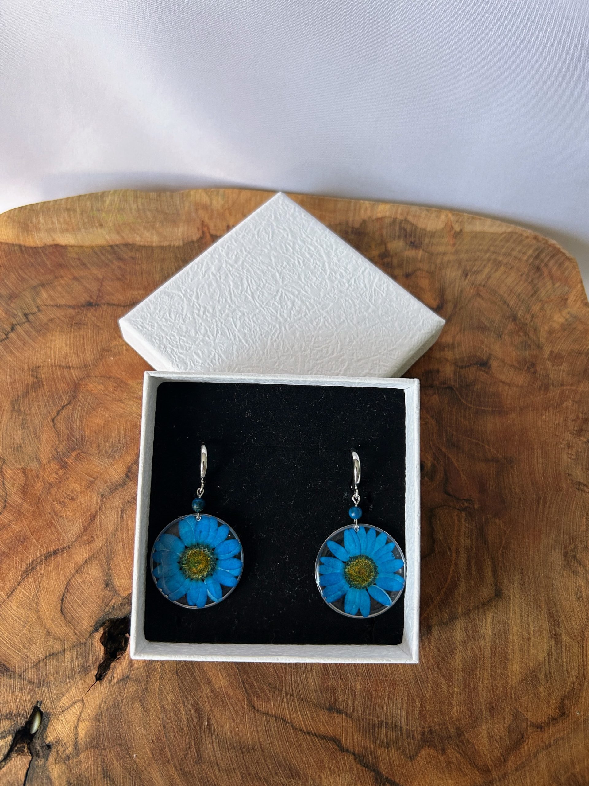 Okazałe, a jednocześnie subtelne kolczyki wiszące, które łączą w sobie delikatność suszonych kwiatów i krystaliczną głębię żywicy epoksydowej. W okrągłej, stalowej ramce w kolorze srebrnym zatopiono duży, niebieski kwiat, tworząc wyjątkową kompozycję inspirowaną naturą i jej spokojem.
