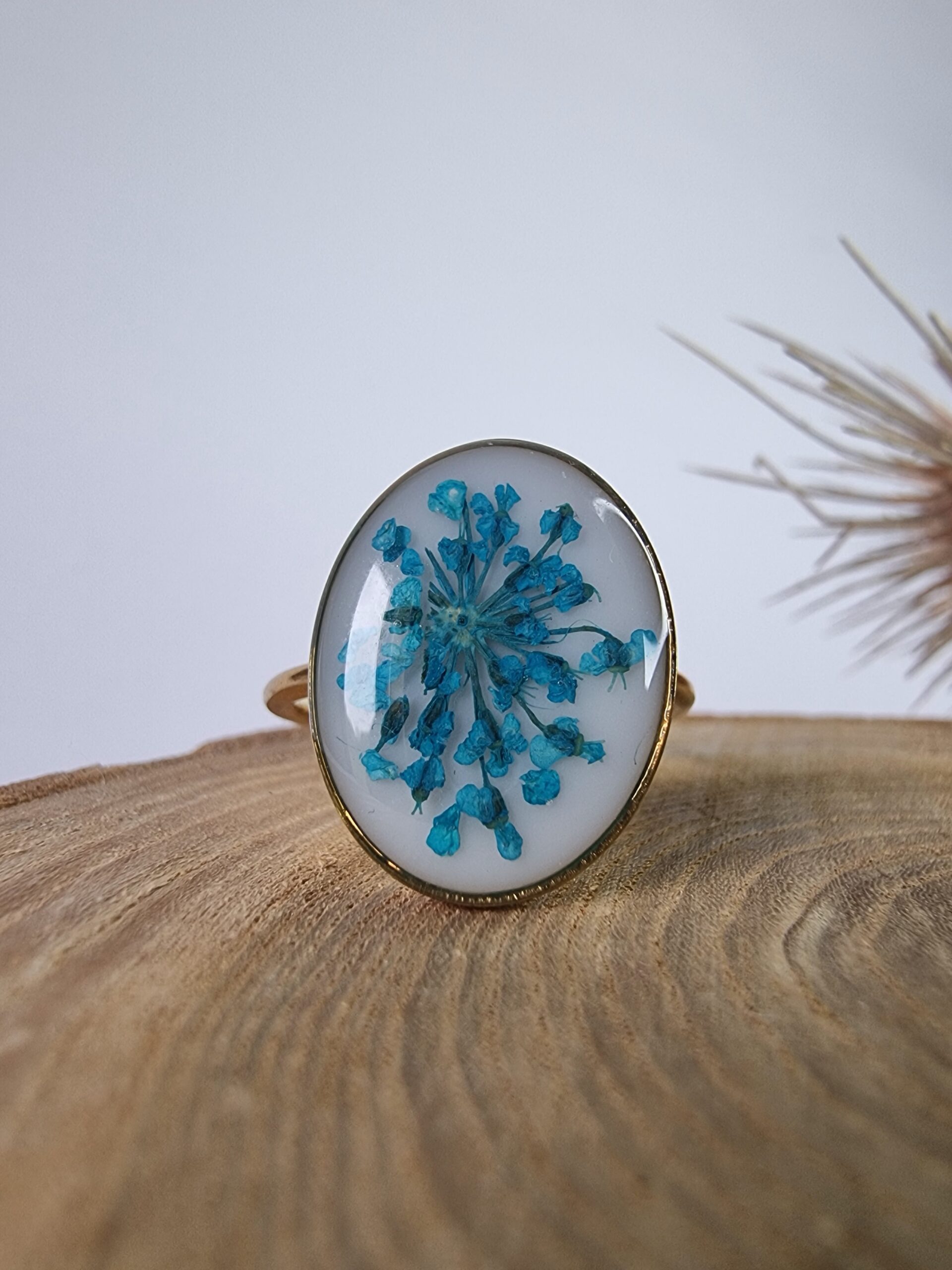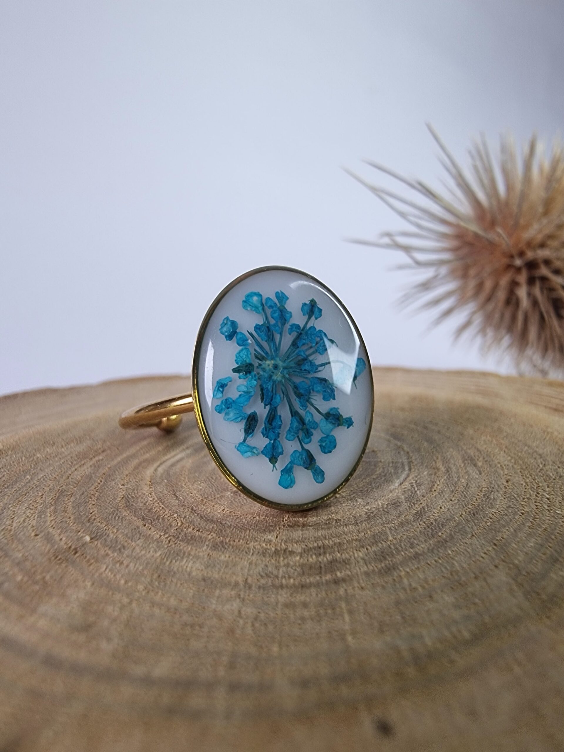 Unikatowy pierścionek, prezentujący piękne połączenie suszonych kwiatów oraz żywicy epoksydowej.
