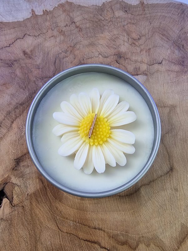Świeca sojowa w puszce z drewnianym knotem zdobiona Stokrotką z wosku.