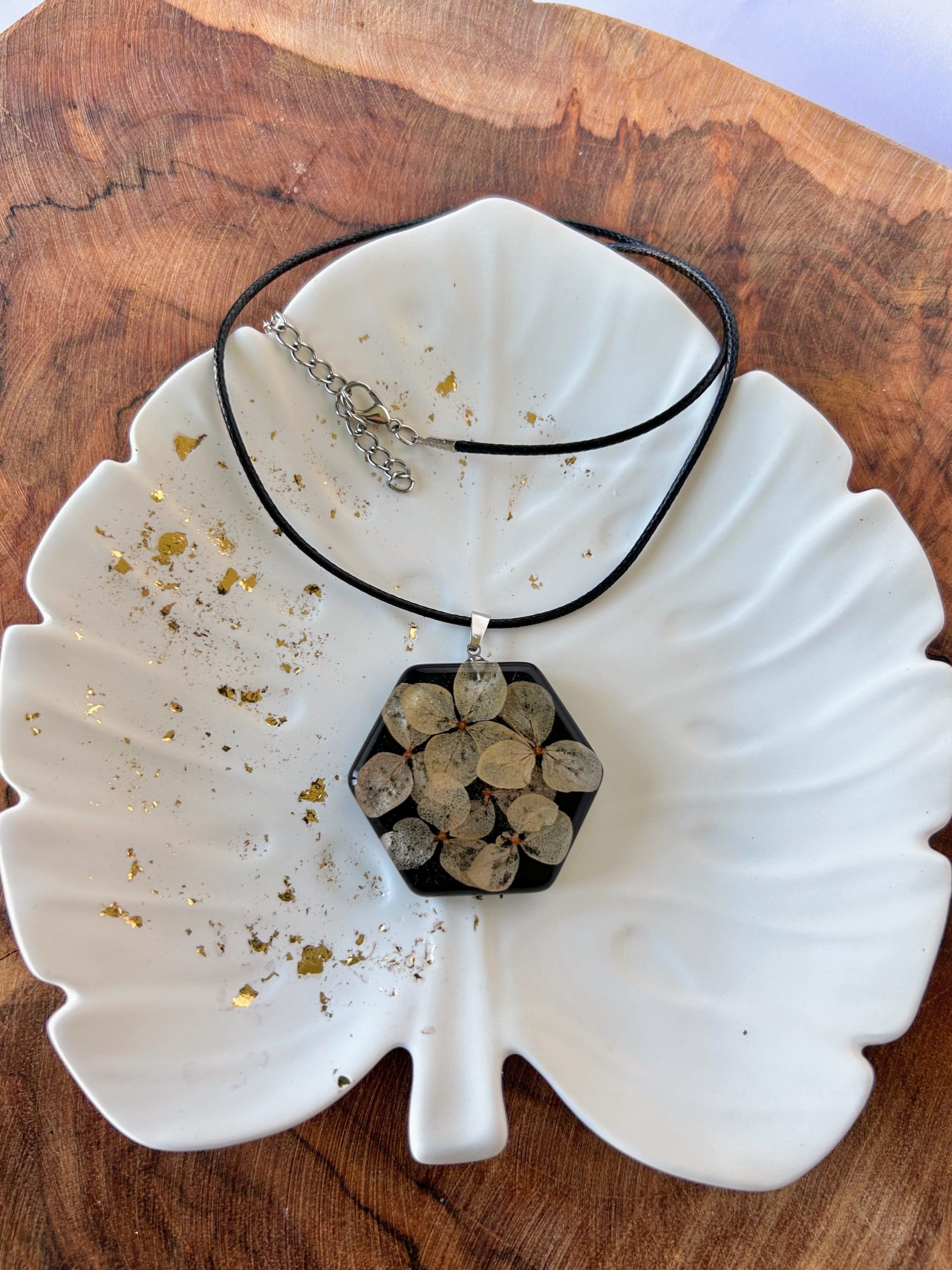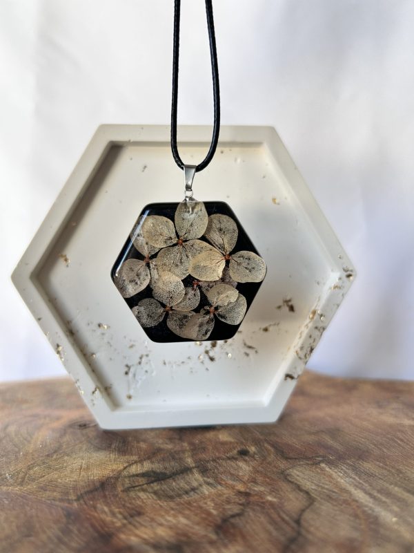 Zatrzymaj piękno natury na zawsze dzięki wyjątkowemu wisiorkowi z żywicy epoksydowej. Delikatna hortensja w subtelnym, beżowym odcieniu została zatopiona na głębokim, czarnym tle, co podkreśla jej naturalne piękno i wyjątkowy charakter. Kształt sześciokąta nadaje biżuterii nowoczesnego wyrazu, a srebrna krawatka dopełnia całości, nadając jej elegancji.